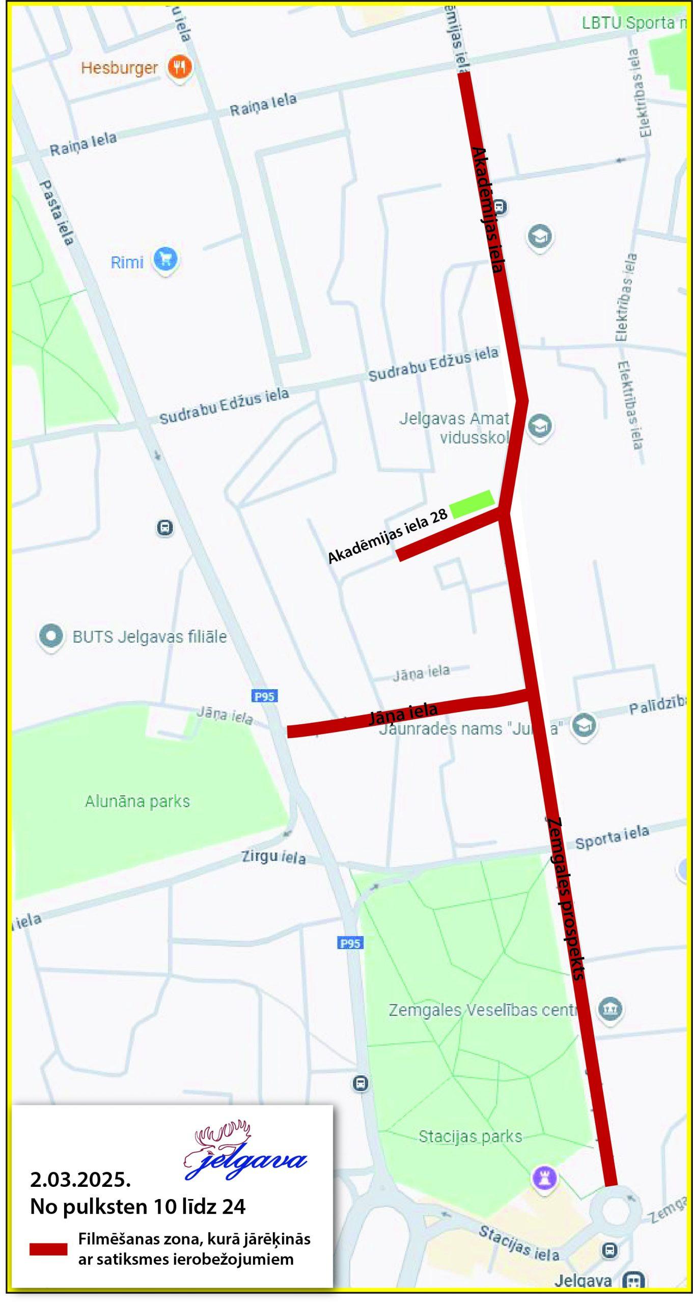 Filmēšanas laikā 2. martā tiks izslēgti luksofori Zemgales prospekta un Sporta ielas, kā arī Zemgales prospekta un Palīdzības ielas krustojumā. Satiksme tiks organizēta saskaņā ar ceļa zīmēm.