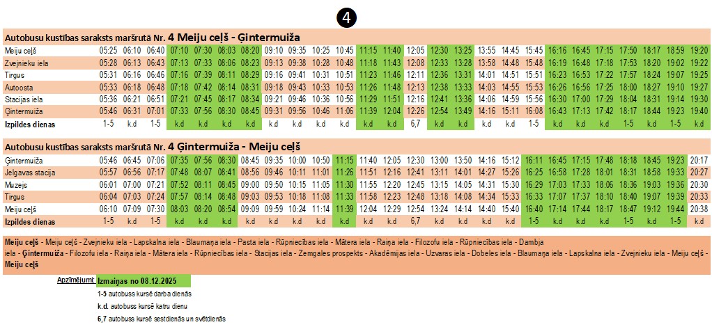 Savukārt no 8. decembra, nepalielinot pārvadājumu apjomu, izmaiņas būs kopumā 46 reisiem četros minētajos pilsētas autobusu maršrutos. Jāpiebilst, ka lielākās izmaiņas skar 4. maršruta Meiju ceļš–Ģintermuiža autobusu kursēšanas grafiku – tas daļēji saistīts ar autobusu un vilcienu kursēšanas grafika salāgošanu.