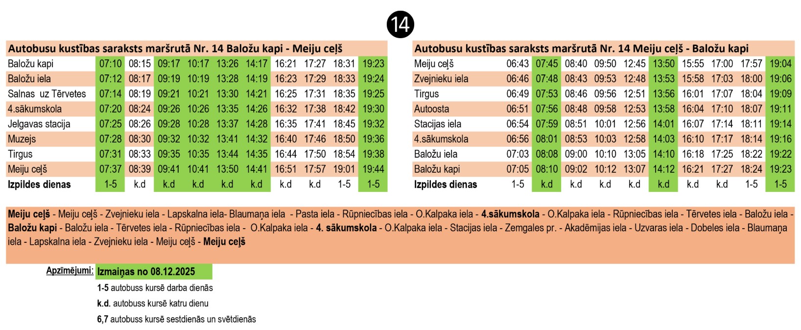 Savukārt 14 maršrutā «Meiju ceļš – Baložu kapi», izvērtējot saņemto iesniegumu no Jelgavas 4. sākumskolas Vecāku padomes, viens reiss pielāgots mācību stundu grafikam 4.sākumskolā, un tas skolēniem pēc stundas ļaus nesteidzoties nokļūt līdz autobusa pieturvietai.