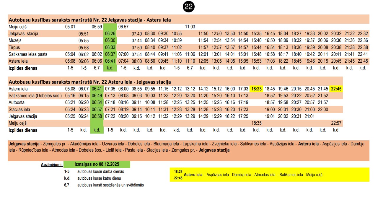 Bet 22.maršrutā tiek grozīti divu reisu izpildes laiks, lai izveidotu labāku sasaisti ar vilcienu kustības grafiku.